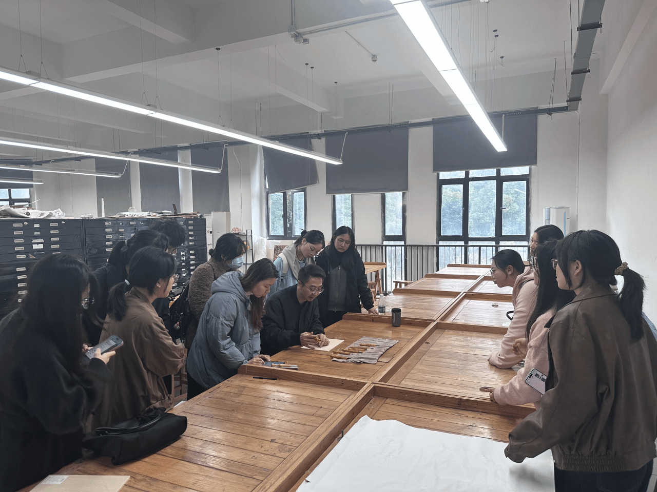 讲座结束后,臧亮老师为到场的同学们分发了木板、刻刀等制作工具,并在版画工作室现场演示了不同类型刻刀的使用方法与雕刻技巧。他耐心讲解了线条的走向控制、刀法的深浅变化及图形刻制的结构逻辑,以及如何通过刀具的角度与力度表现不同的线条质感,带领同学们体验版画创作的基本流程,使大家在实践中直观感受到版画艺术的魅力与手作的温度。