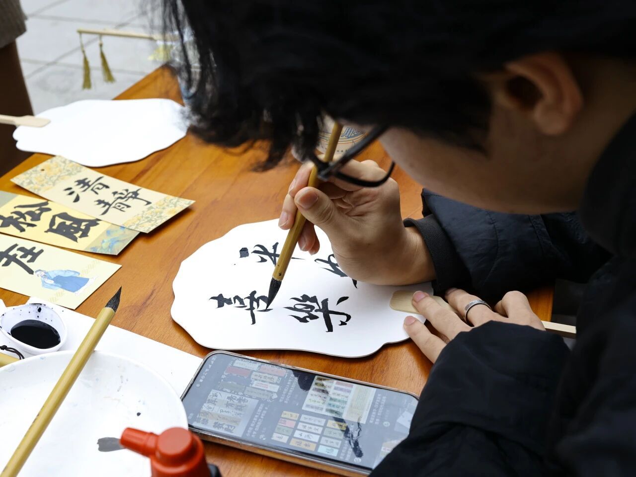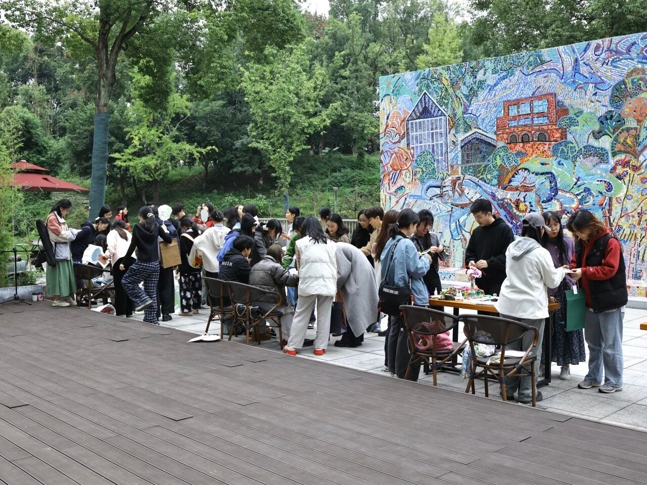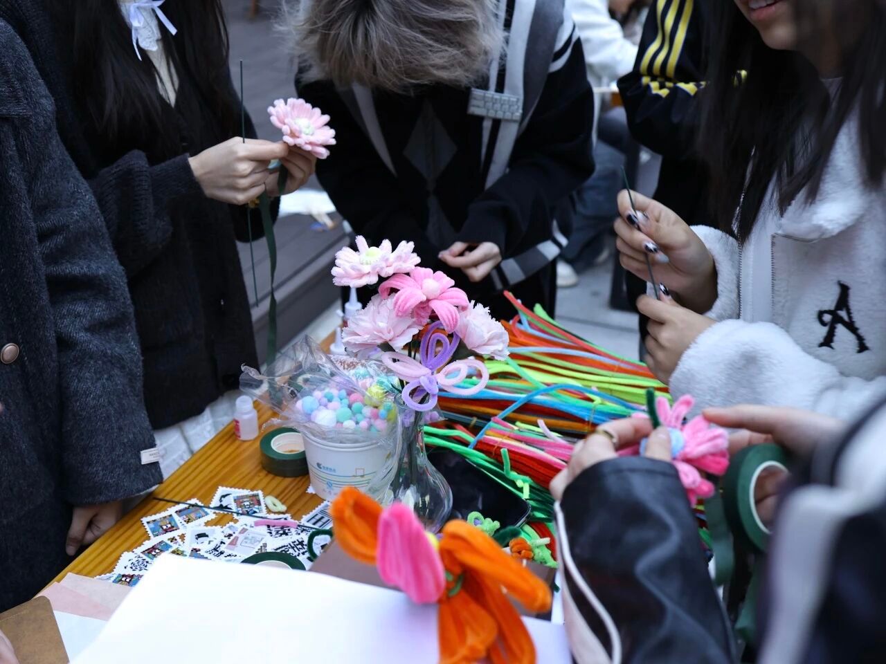 现场设置有书签工坊、扇面工坊和扭扭棒工坊三大体验区,成为师生现场创作与交流的实践平台。参与师生运用漂漆工艺制作出精美和书签和团扇,绘制图案、书写愿景,在漆料流动间充分体悟到了艺术张力与文化底蕴。扭扭棒创作则以轻松有趣的方式激发大家的想象力,师生在指尖创作中交流技巧、分享成果,现场氛围温馨而活跃。