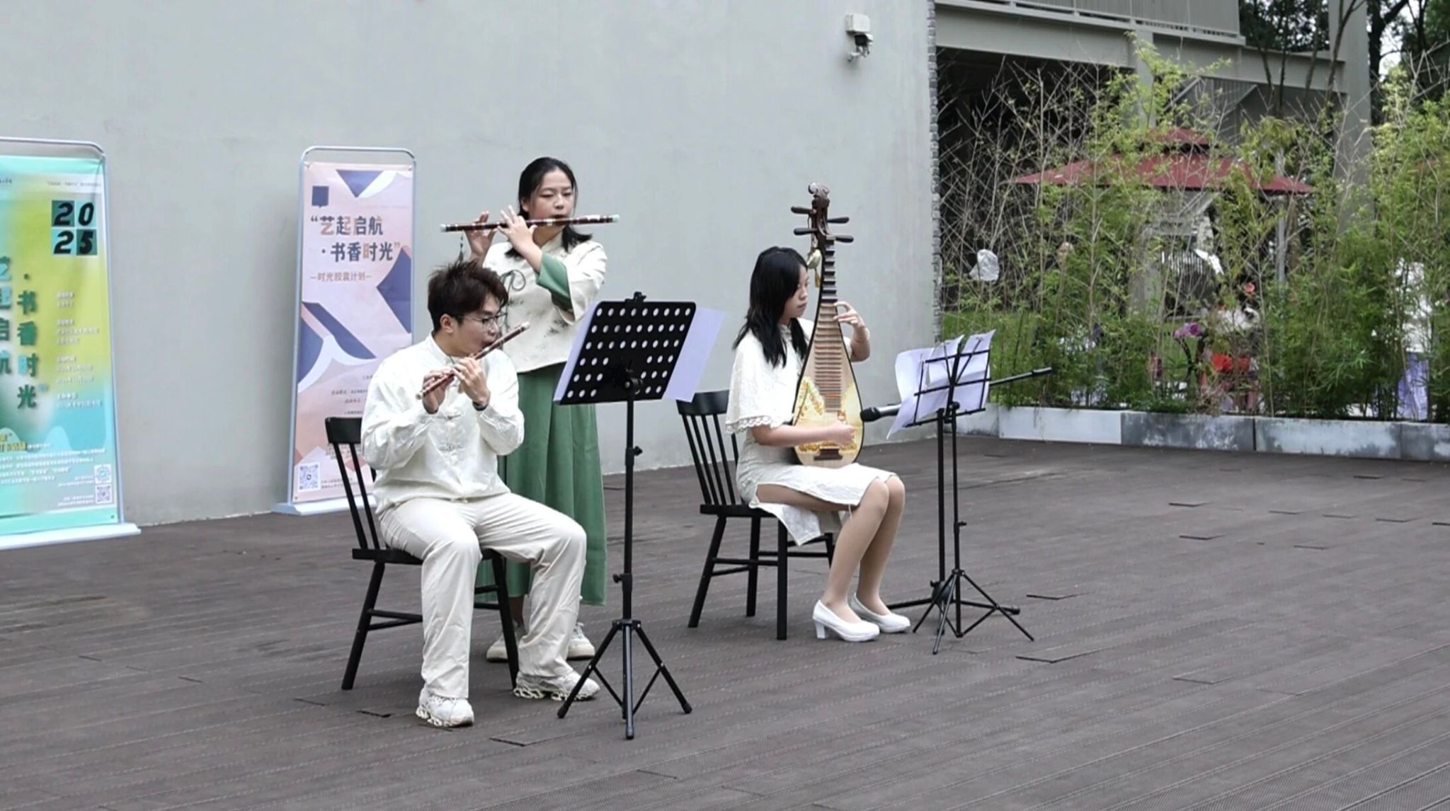 活动内容涵盖书展打卡、时光胶囊、文化体验、艺术展演四大板块,形式多样、亮点纷呈。在开场表演中,我校大学生艺术团同学们演绎了中国舞《十八焕蝶》与琵琶竹笛合奏《美丽的神话》,以舞传情、以乐达意,让现场师生沉浸式感受“书乐共舞”的雅致意境。