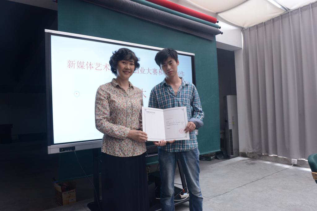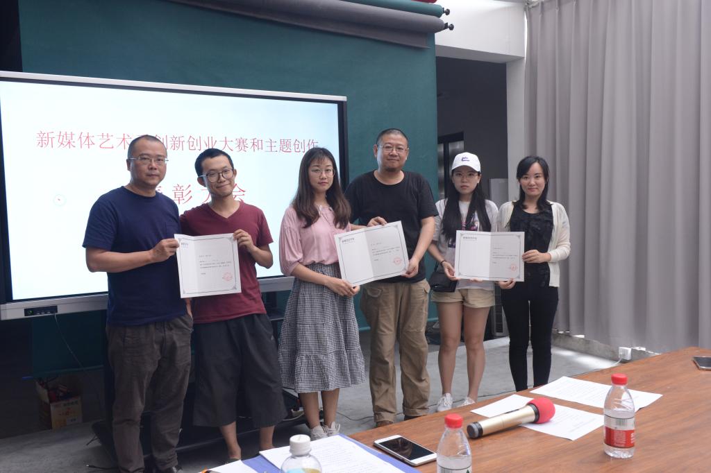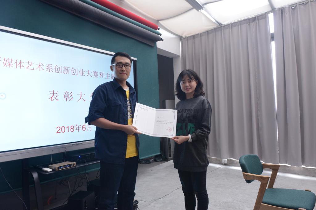 李川老师宣读了新媒体艺术系的表彰决定,并对获奖的7位同学颁发了奖励证书和奖金。获奖同学代表李昊星介绍了参加创新创业大赛的规则、最初思路、团队组建等情况。