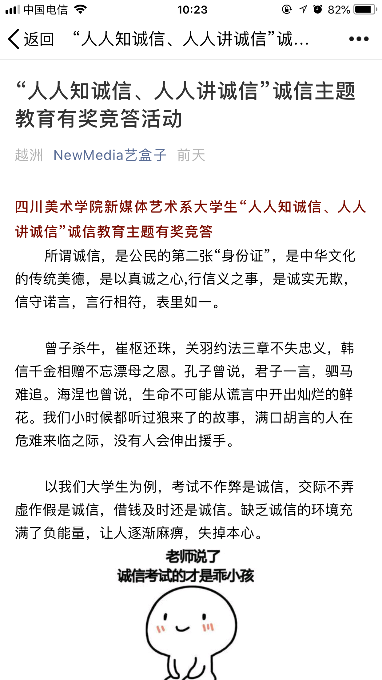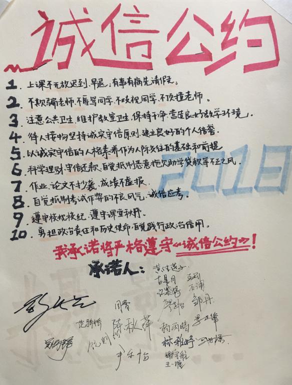 按照我校开展诚信教育主题活动的要求和精神,新媒体艺术系近一个礼拜开展了诚信教育主题系列活动:一、召开主题班会,鼓励同学们制作诚信公约,并在教室张贴,成为人人看得见的行为准则;二、12月4日——6日,由新媒体艺术系团总支、学生会策划了“四川美术学院新媒体艺术系‘人人知诚信、人人讲诚信’诚信教育主题有奖竞答”网上答题活动,该活动针对全系学生进行全覆盖,题目内容包括了学生手册学生行为规范和国家助学贷款等内容,并对成绩在全系前10%的同学进行了奖励;