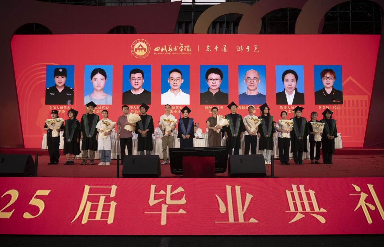 2025届的毕业生代表向大学期间无私耕耘、默默奉献的教学、管理及后勤管理人员献花致谢,表达衷心的感恩之情。在感恩致谢环节,老师们“金句”频出,句句有梗,送出的毕业祝福,很“川美”,用最简单的话道出了对同学们最窝心的祝福。中国画与书法艺术学院专业教师朱小坤祝福全体毕业生“工资条像点彩派——越点越密!甲方需求如极简主义——越少越好!”,医务代表、高新区第一人民医院鲁剑利医生祝福全体毕业生“前程无病历,人生无急诊,永远健康快乐!”,宿管阿姨李素吾嘱托毕业生“以后不要过分熬夜,记得早点回家”,影视动画学院辅导员刘春宇祝愿毕业生小伙伴们“方案总被点赞,灵感持续发电,累了随时靠岸,导员永不下线,常回来看看——川美的猫在老地方等着大家!”。