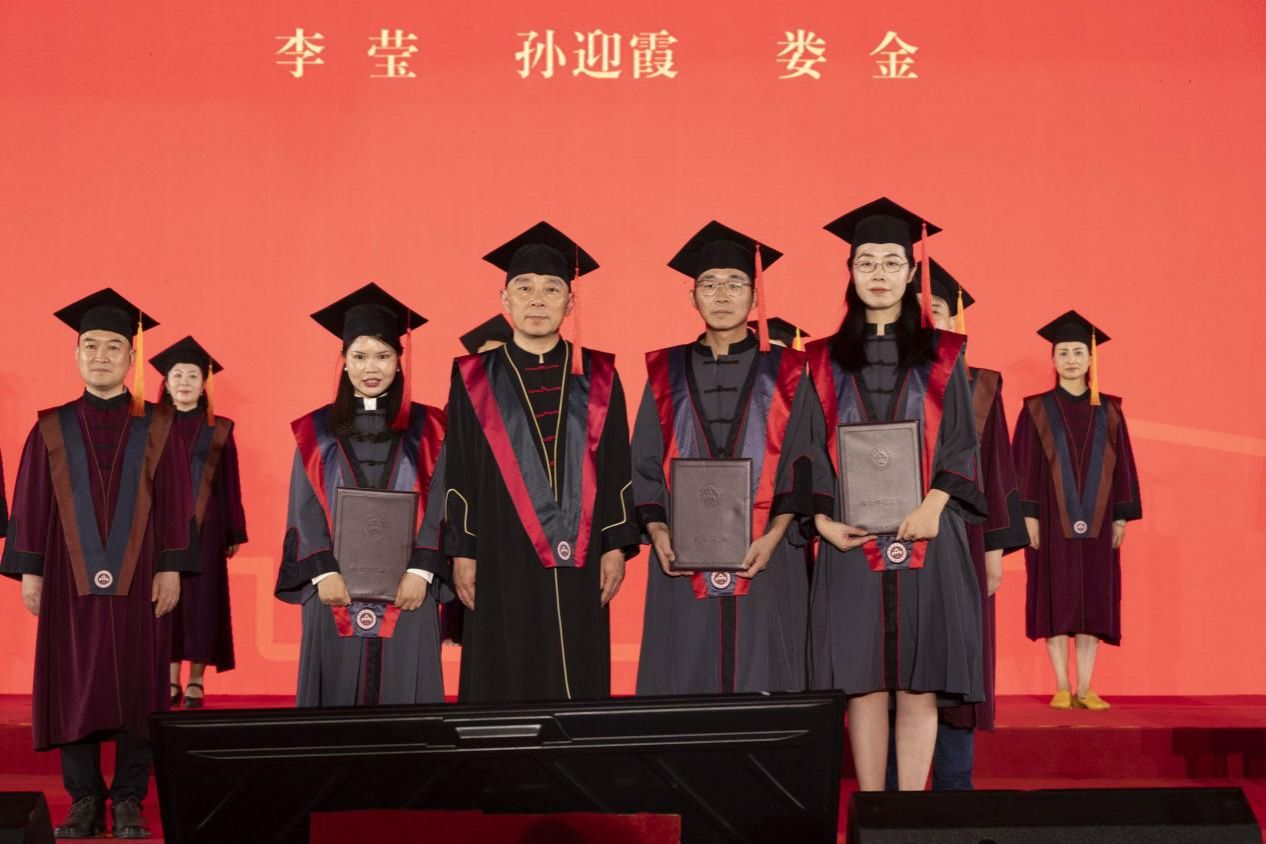 在授位仪式上,学位评定委员会主席焦兴涛院长宣读了学位授予决议并为首届博士学位的毕业生拨穗授位;学位评定委员会委员为所有取得硕士学位的研究生和取得学士学位的本科生拨穗授位。获得学位的毕业生以饱满的热情有序排队依次上台,通过鞠躬致谢表达对母校和老师的诚挚谢意。