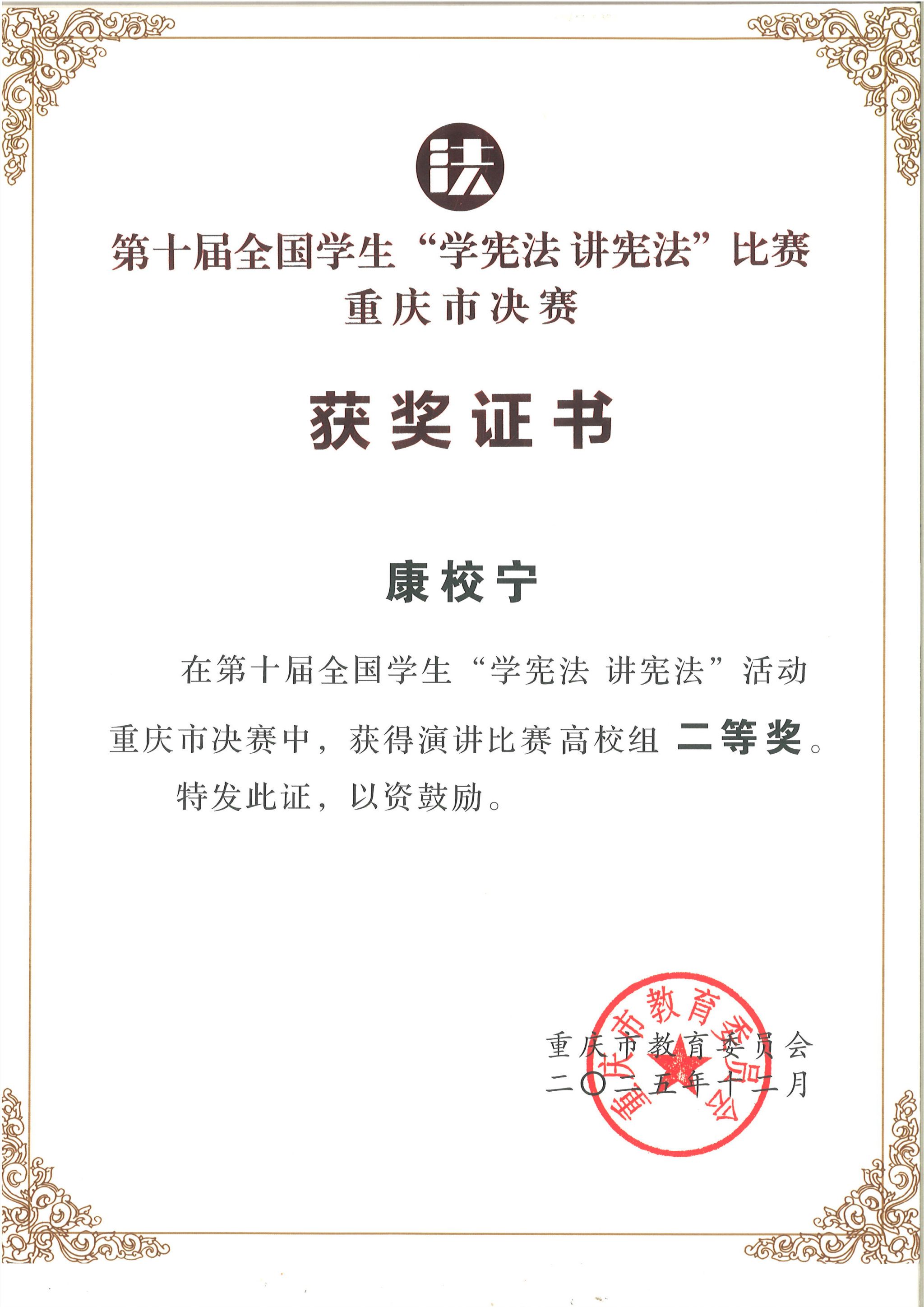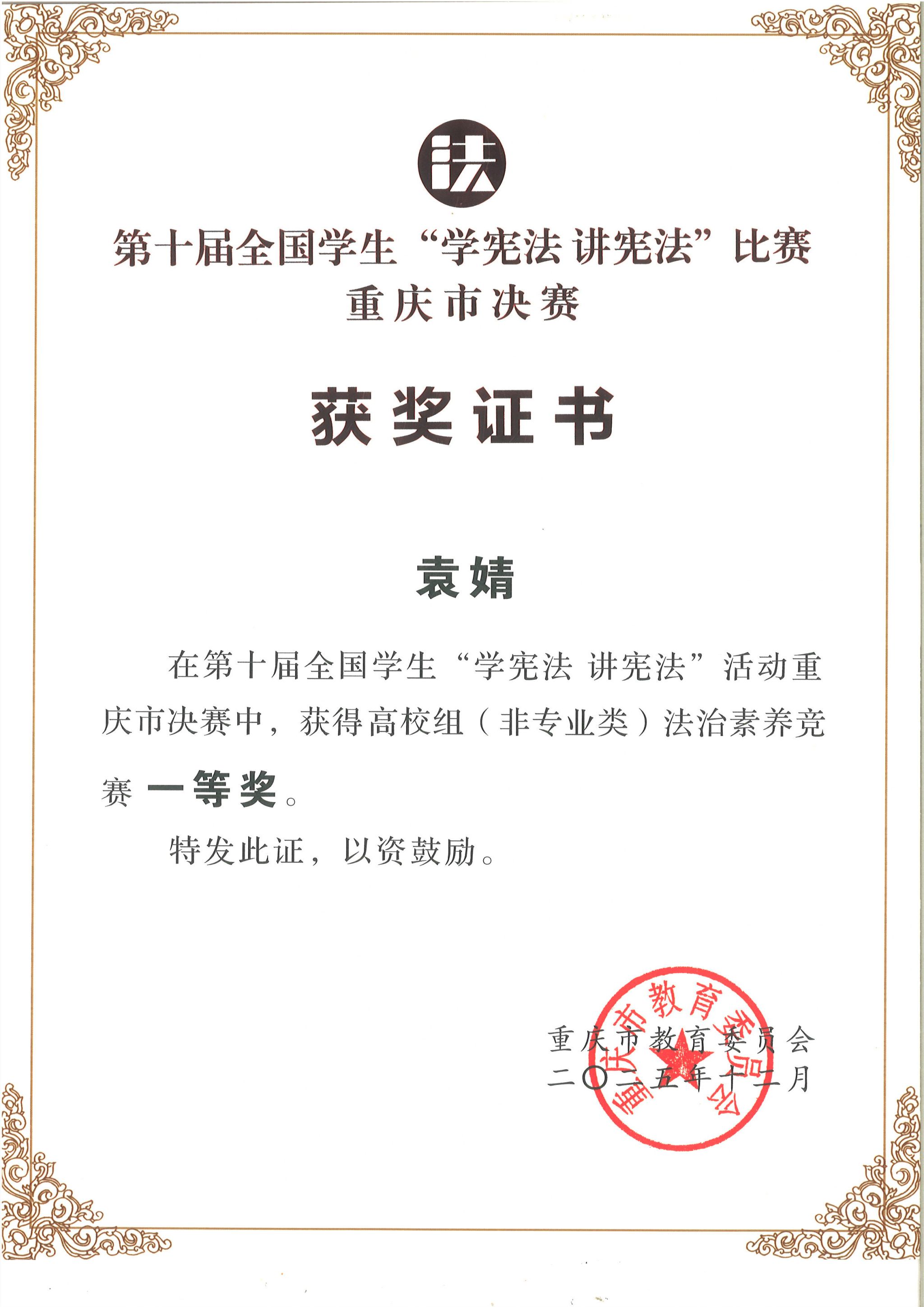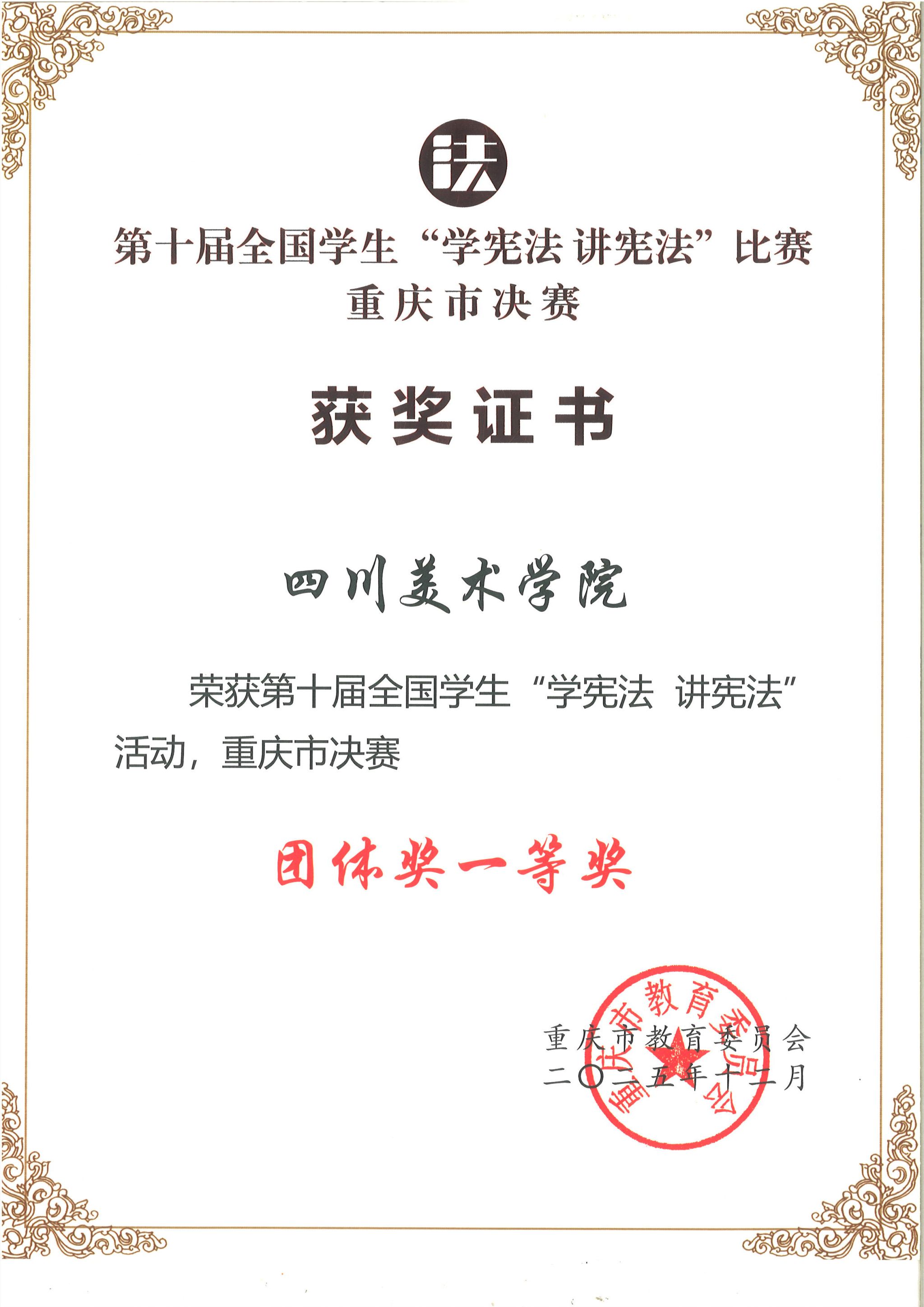 近日,重庆市教育委员会公布第十届全国学生“学宪法 讲宪法”活动重庆市决赛获奖名单,其中,学校获团体奖一等奖,中国画与书法艺术学院学生袁婧获高校组(非专业类)法治素养竞赛一等奖(指导老师:黄源),设计学院学生康校宁获高校组演讲比赛二等奖(指导老师:白乡林、邓均),为我校在该赛事中的历史最好成绩。