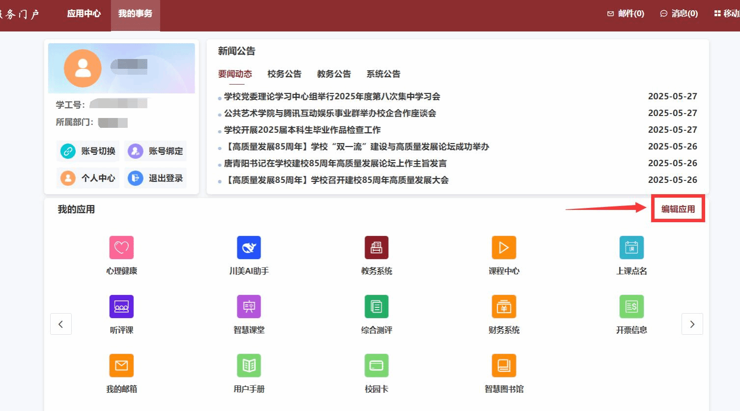 2.点击“编辑应用”,添加“‘一站式’学生事务网上服务”。