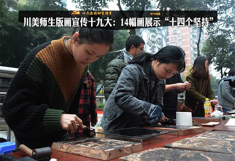 党的十九大报告提出“十四个坚持”—— 坚持党对一切工作的领导;坚持以人民为中心;坚持全面深化改革……怎样把这些基本方略传达给老百姓,讲得清楚、讲得明白?12日上午,四川美术学院版画系的师生们便别出心裁地现场印制14幅版画,生动地讲述了党的十九大精神。
