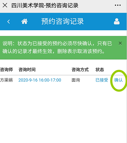 03 点击“预约记录”查看咨询是否预约成功,并点击“确认”