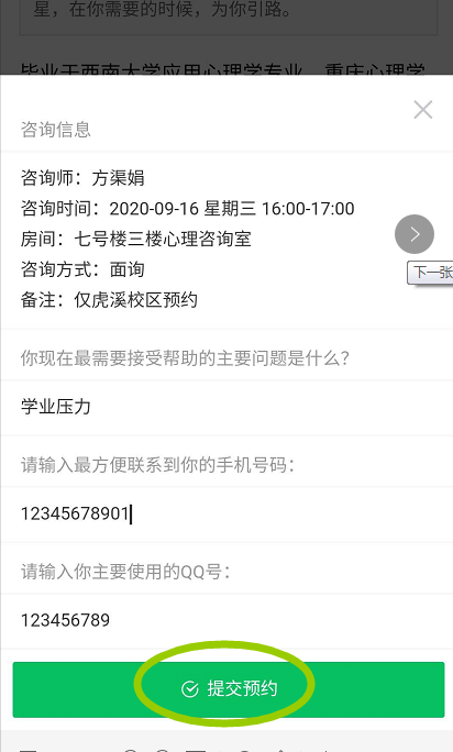 2.预约咨询成功后,咨询前,请提前三分钟达到咨询室(小提示,定个闹钟提醒自己奥)。