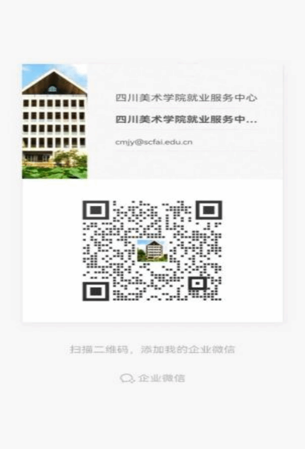 即日起,各用人单位可通过官方邮箱cmjy@scfai.edu.cn;或扫描下方二维码添加“四川美术学院就业服务中心”官方企业微信(请备注单位名称),预约9月8日及以后的线下宣讲会,用人单位须将营业执照(副本)、招聘简章(用人单位简介、选聘条件、所需专业及职位数、考核方式、简历投递方式等)发送至官方邮箱或官方企业微信,通过审核后方可进行场次和场地的预约。