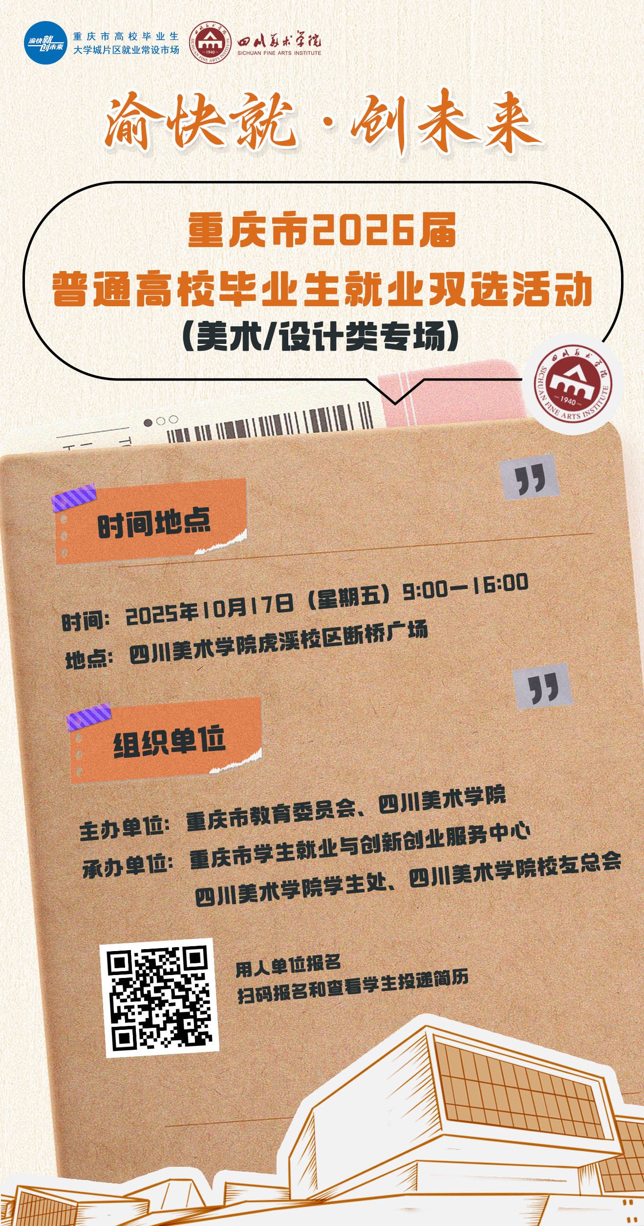 为协助各类美术/设计类用人单位引进人才,促进毕业生高质量充分就业,由重庆市教育委员会、四川美术学院主办的“渝快就·创未来——重庆市2026届普通高校毕业生就业双选活动(美术/设计类专场)”于2025年10月17日(星期五)举行,诚邀各类用人单位参加。现将本次活动有关事项函告如下: