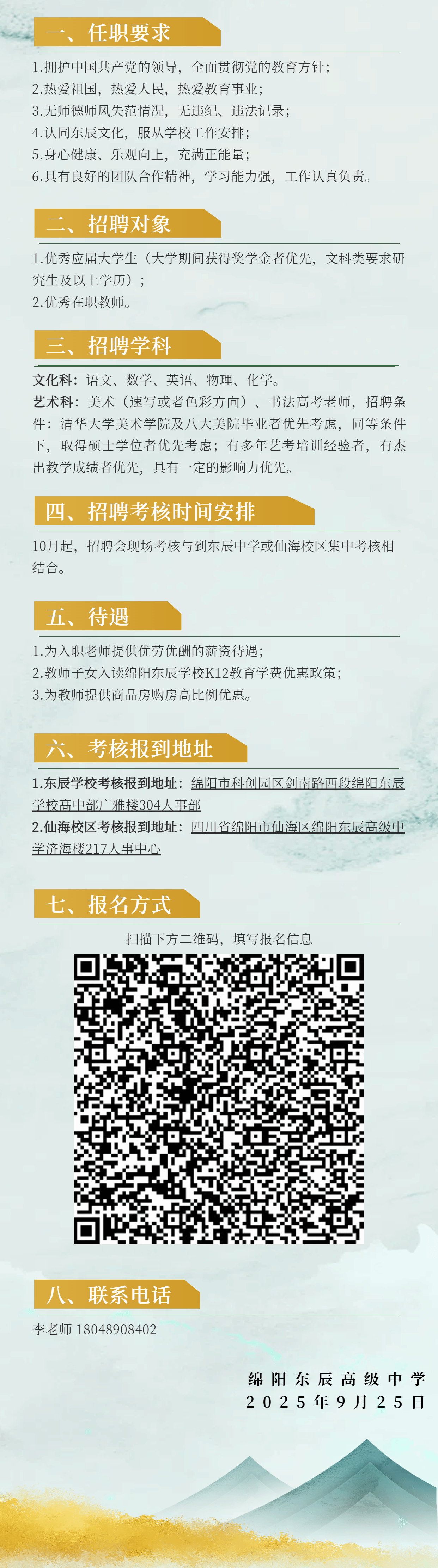 伯乐识良骏,明灯照前路。绵阳东辰高级中学(绵阳东辰中学仙海校区)成立于2022年,坐落于美丽的4A级风景区仙海风景区,仙海高中与东辰中学作为一校两区,实施统一管理模式,统一进行教师调配,并通过德育立校、质量名校、数理兴校、体育强校举措,从而实现高品质发展、个性化发展、特色化发展。 做有温度的教育,做有高度的教育,做有尊严的教育。虚位以待,静候君来;伯乐觅贤,共铸辉煌!我校面向全国广纳教育英才,诚邀德才兼备、怀瑾握瑜之士加入我们的行列。我们深知,教育之兴,系于良师;学子之成,源于匠心。您不仅是知识的传递者,更是未来的塑造者。我们珍视每一位教育者的智慧与热忱,愿以最大的诚意与尊重,为您提供施展才华的广阔舞台、携手共进的发展空间与温暖坚定的支持保障。 在这里,您的教育理想将被郑重聆听,您的专业成长将被全心托举,您的每一份付出都将被铭记与致敬。我们期待与您并肩,以思想点燃思想,以人格影响人格,共同书写教育事业的隽永篇章!