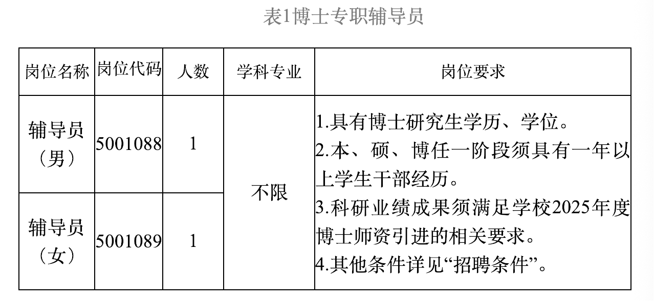 计划招聘博士专职辅导员2人,硕士专职辅导员8人,具体如下: