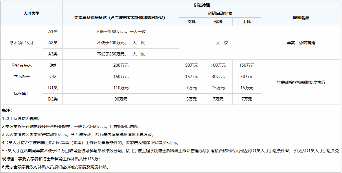 宁波工程学院高层次人才引进类型包括:学术领军人才(A1、A2、A3,正高级职称),学科带头人(B,正高级职称),学术骨干(C,副高级职称),优秀博士(D1、D2,中级职称)和师资博士后(E)。