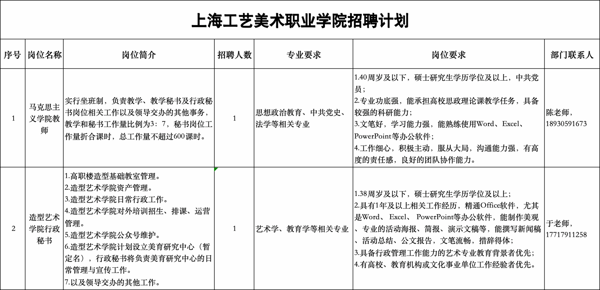 公开招聘马克思主义学院教师、造型艺术学院行政秘书等岗位2人。