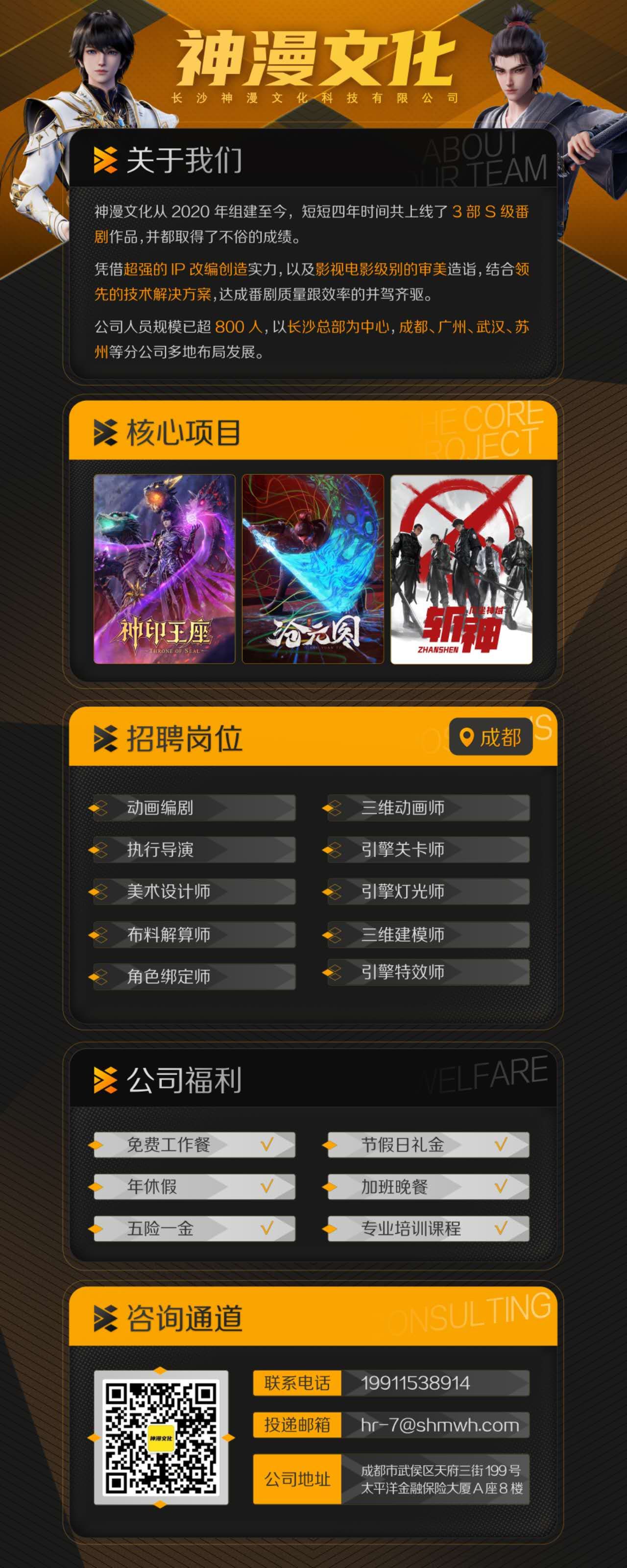 神漫文化从 2020 年组建至今,短短四年时间共上线了3部S级剧作品,并都取得了不俗的成绩。凭借超强的IP 改编创造实力,以及影视电影级别的审美造诣,结合领先的技术解决方案,达成番剧质量跟效率的并驾齐驱。公司人员规模已超 800 人,以长沙总部为中心,成都、广州、武汉、苏州等分公司多地布局发展。