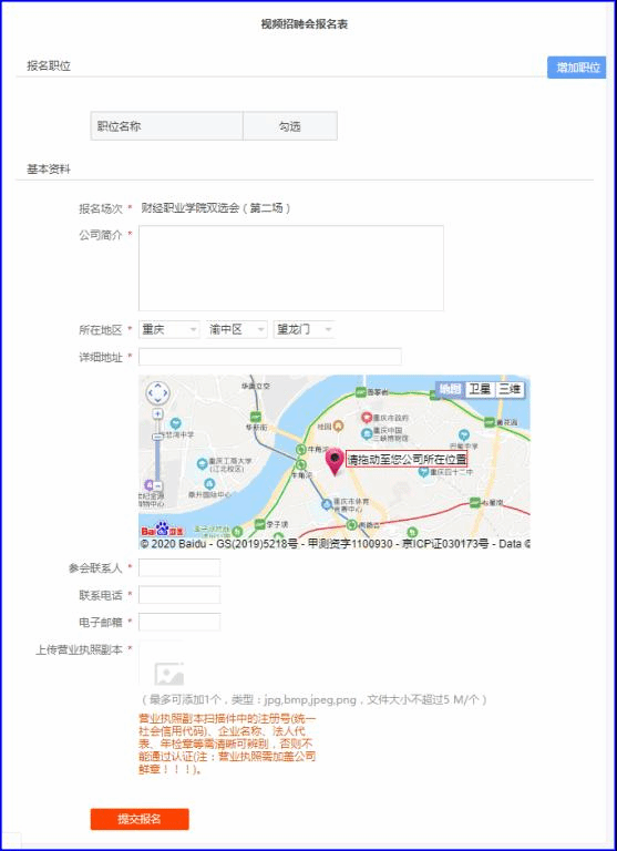 2、账号注册完成后,点击“增加职位”发布招聘岗位,并勾选够提交报名。报名后,进入活动页面根据活动引导完成视频面试时间设置,高校审核通过后即可参与本次活动。审核通过时,将以短信通知到企业,企业在活动当天进入会场完成视频面试。