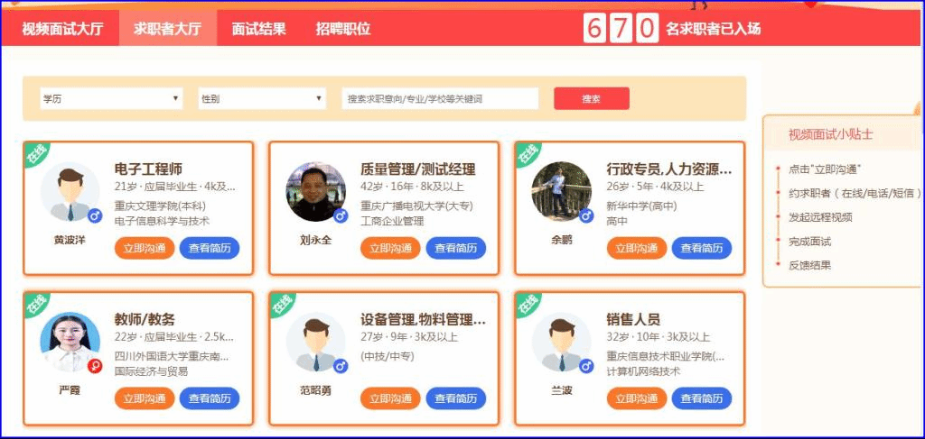 3、若没有求职者申请视频面试,HR可在求职者大厅搜索符合岗位要求的简历进行沟通(求职者大厅下载的简历需学生回复后方可进行视频面试,且必须把主动申请的学生面试完成后才能在求职者大厅搜索简历进行沟通)。