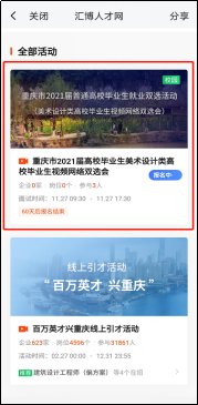 为协助各类美术/设计类用人单位引进人才,促进毕业生充分、优质就业,重庆市大学中专毕业生就业指导服务中心将于2021年11月27日举行“重庆市2022届美术设计类高校毕业生视频网络双选会”。诚邀广大用人单位及毕业生积极参与。现将本次双选会有关事项函告如下: