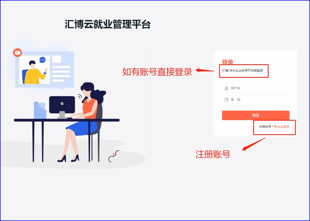 1.企业登录huibo.cn/adigy(电脑端登录),点击“企业报名”注册并发布职位。(“汇博招聘”会员可以直接使用账号密码进行登录,并同步平台已发布职位,勾选报名即可)