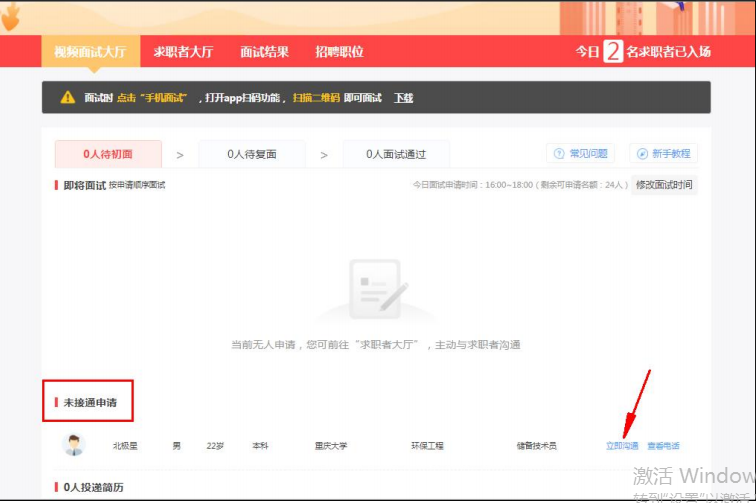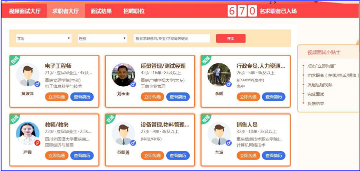 1、审核通过后在大厅处接收简历,若有求职者投递简历,可以点击“立即沟通”或“查看简历”,若无求职者投递则可主动在求职者大厅搜索合适的求职者,查看后可选择“邀面试”“待定”“不合适”“立即沟通”四种选项告知求职者结果即可。(示例图如下)