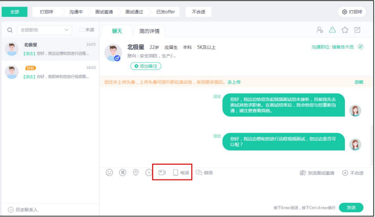 4、企业 HR 点击沟通之后进入聊天界面,可进行文字、视频及电话交流,界面如下图