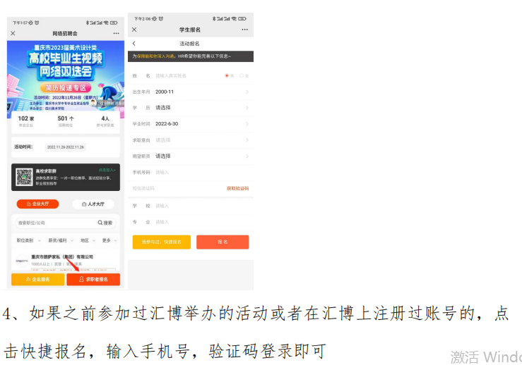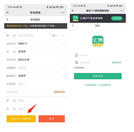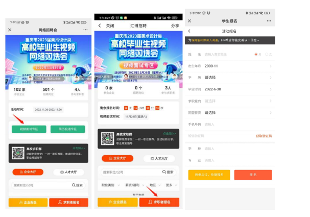 2、点击进入对应场次后,点击“视频面试专区”,进入求职者报名界面,并根据要求填写报名信息。(如果有汇博账号,可以点击快捷报名)