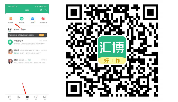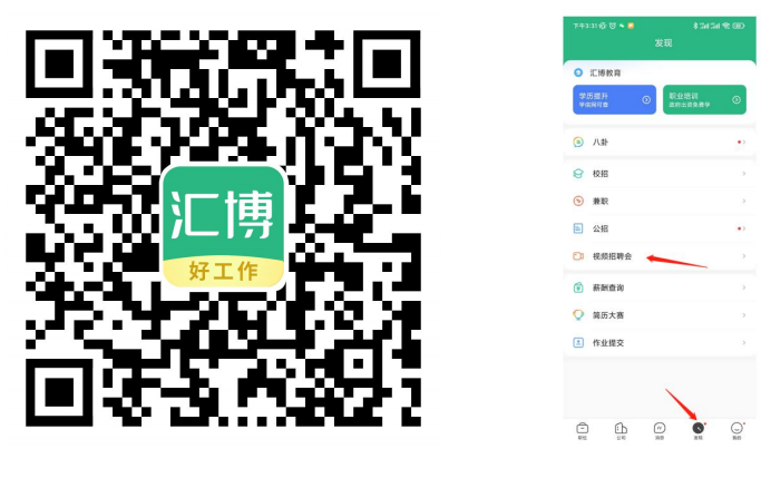 1、扫码下方二维码或前往应用市场下载“汇博招聘”APP 完成下载并注册登录。点击下方菜单栏“发现-视频招聘会”,选择“四川美术学院秋季双选会”活动专场,或点击活动链接:进入活动页面。(可点相应链接提前查看参会企业详情,视频面试功能需通过 APP 入口进入)