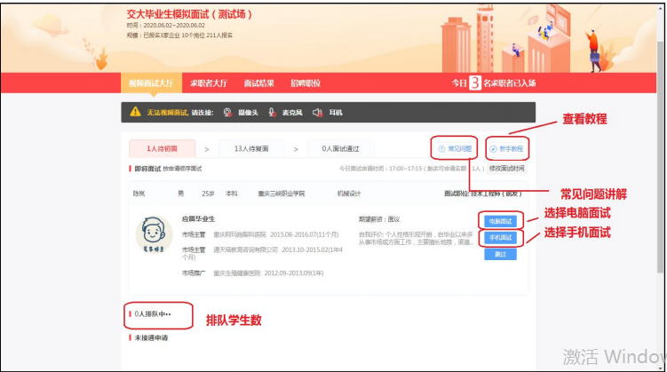 视频面试专区:活动当天,该专区的企业会实时在线,求职者可以向有意向的企业申请视频面试。企业同意后,排队进行一对一线上视频面试(具体操作请看视频面试操作流程)