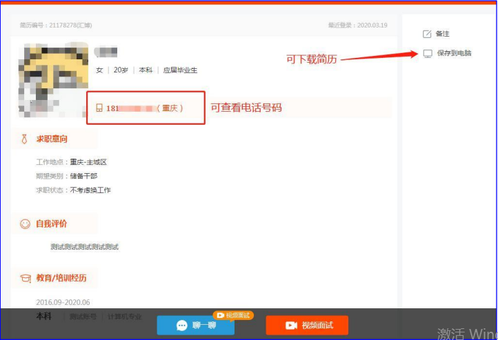 5、若没有求职者申请视频面试,HR 可在求职者大厅搜索符合岗位要求的简历进行沟通(求职者大厅下载的简历需学生回复后方可进行视频面试,且必须把主动申请的学生面试完成后才能在求职者大厅搜索简历进行沟通)