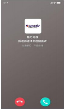 5、当企业邀约面试时,求职者手机会第一时间收到短信,以及面试的声音等同步提醒。当接收到提醒信息后请及时打开汇博 APP 进行视频,展示的页面如下: