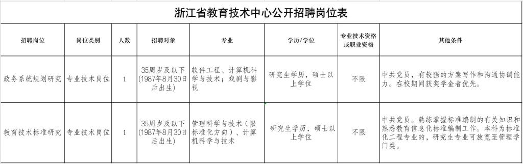 本次招聘需求为政务系统规划研究、教育技术标准研究2个岗位共2人,具体要求见浙江省教育技术中心公开招聘岗位表(附件1)。