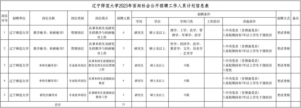附件:辽宁师范大学2023年面向社会公开招聘工作人员计划信息表、