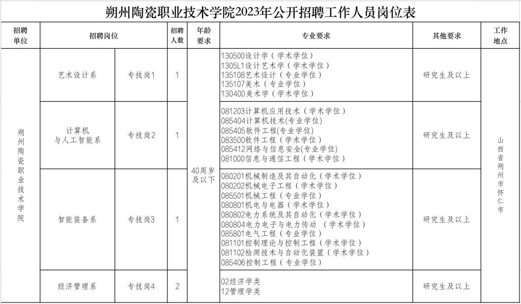 朔州陶瓷职业技术学院 2023 年公开招聘工作人员5名,均为专业技术岗位。招聘岗位所需的具体条件以《朔州陶瓷职业技术学院2023年公开招聘工作人员岗位表》(附件 1, 以下简称 《岗位表》)的要求为准。