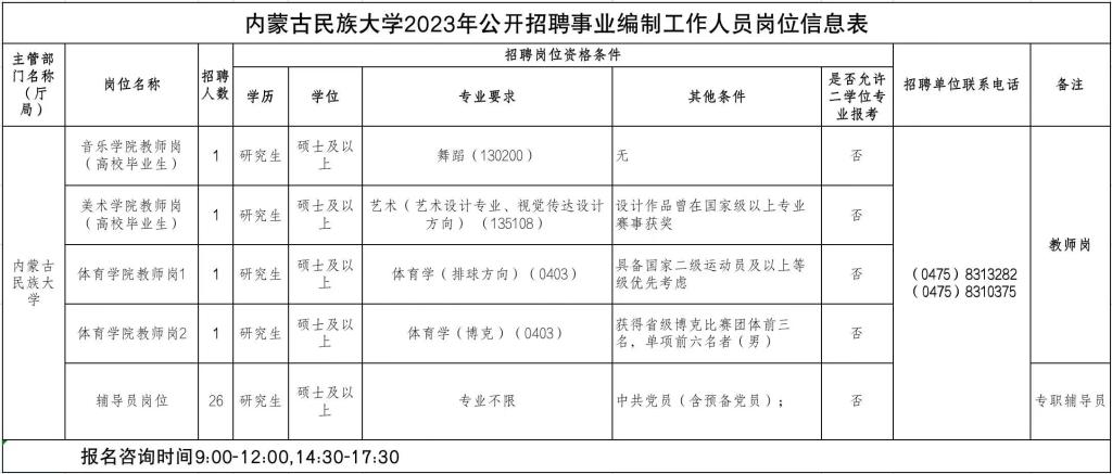 2.《岗位信息表》中涉及的有关学历、学科、专业等资格条件方面的问题,由内蒙古民族大学负责解释。