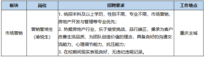 营销管培生(渝悦生)旨在从国内知名高校,选择优秀应届毕业生加入公司,通过一系列专项培养,塑造校招新员工的职业素养和业务能力,促使其尽快融入企业、熟悉业务,快速成长为忠于公司、能力突出的优秀职场人。