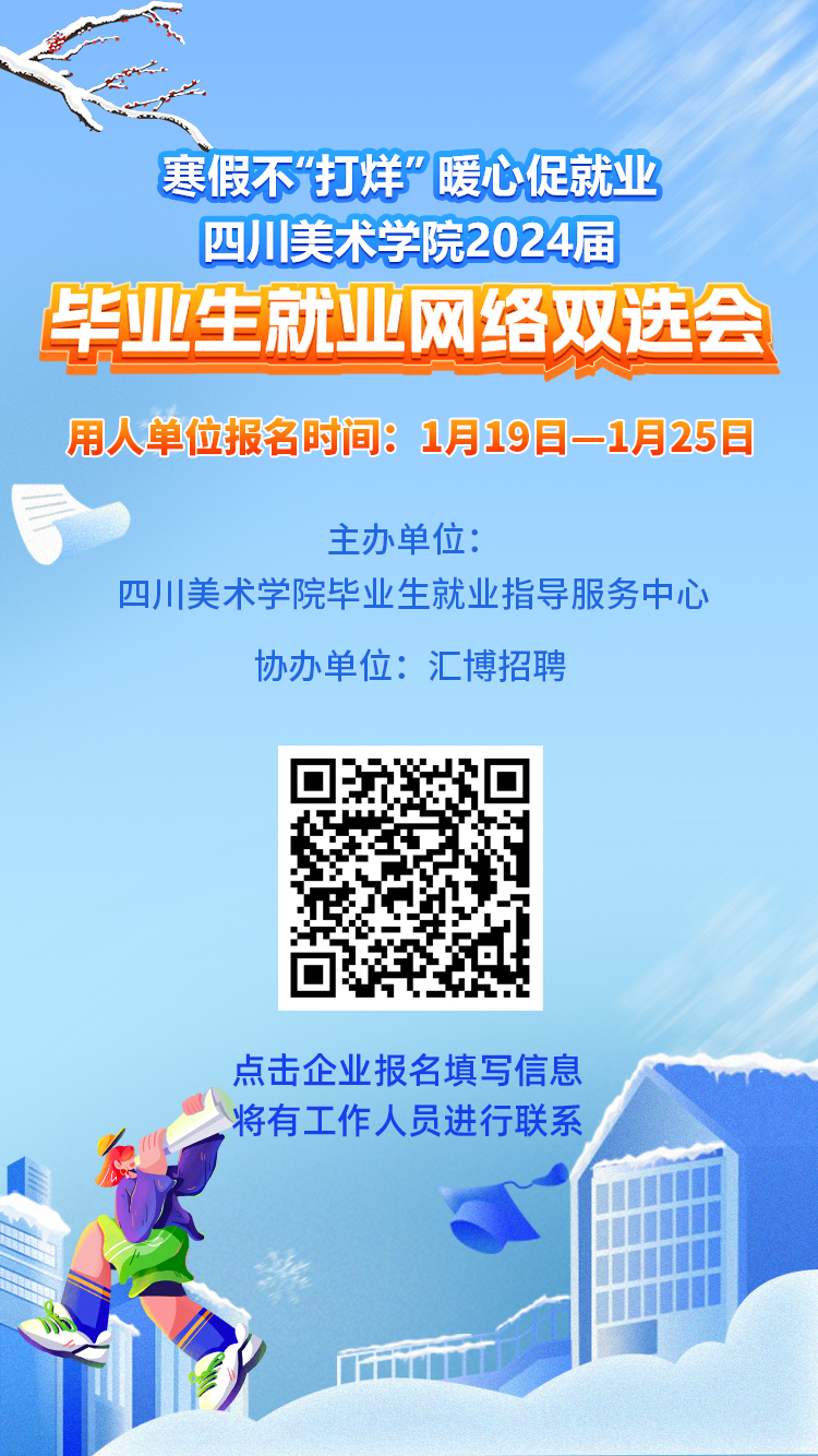 为搭建用人单位和我校毕业生便捷、高效的供需平台,促进毕业生高质量充分就业,我校拟举办寒假不“打烊” 暖心促就业——四川美术学院2024届毕业生就业网络双选会。我们诚挚邀请广大用人单位积极参加,选拔川美优秀毕业生!