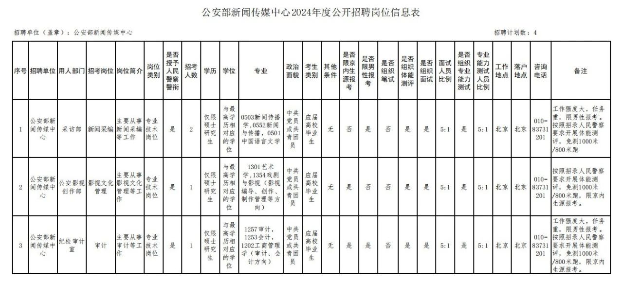 本次招聘共设置3个职位、拟聘用4人,均为人民警察职位。具体职位信息及资格条件详见《公安部直属事业单位2024年度统一招录计划表》(见附件)。