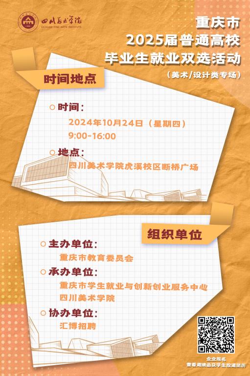 为协助各类美术/设计类用人单位引进人才,促进毕业生高质量充分就业,由重庆市学生就业与创新创业服务中心、四川美术学院承办的“重庆市2025届普通高校毕业生就业双选活动(美术/设计类专场)”于2024年10月24日(星期四)举行,诚邀各类用人单位参加。现将本次活动有关事项函告如下: