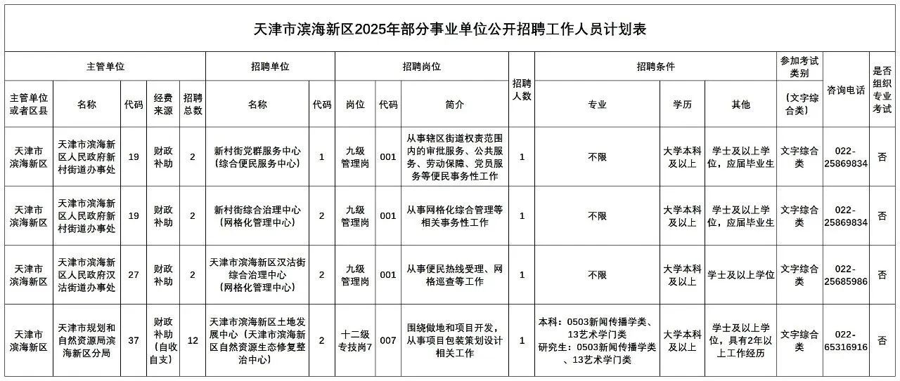 政策咨询电话:见附件《天津市滨海新区2025年部分事业单位公开招聘工作人员计划表》。