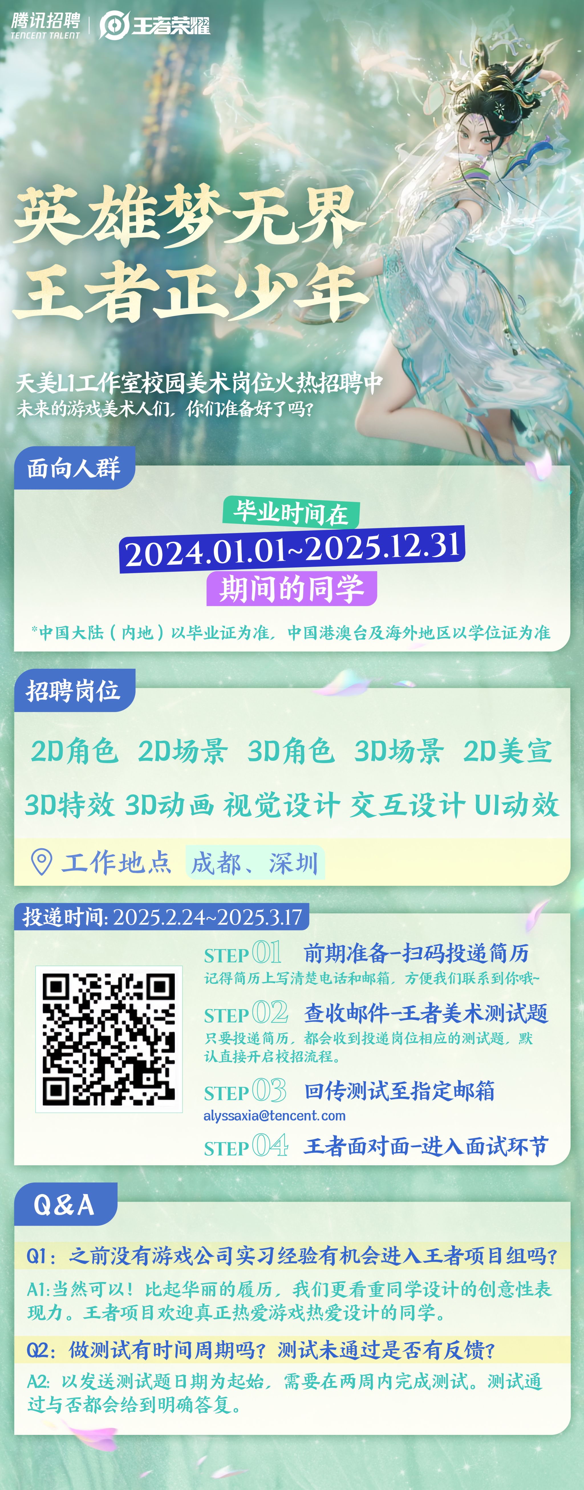 快来扫海报上的二维码,我们便默认你愿意开启王者的校招流程,会给你发放投递岗位对应的测试哦。