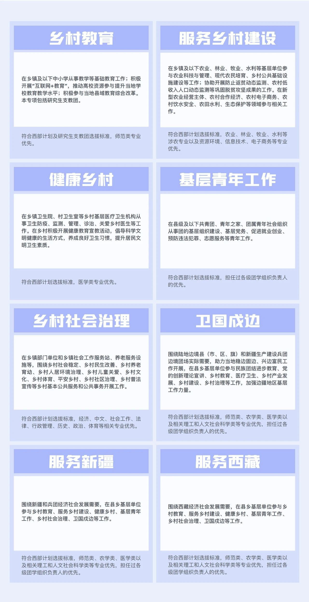 西部计划设置乡村教育、服务乡村建设、健康乡村、基层青年工作、乡村社会治理、卫国戍边、服务新疆、服务西藏,8个专项;