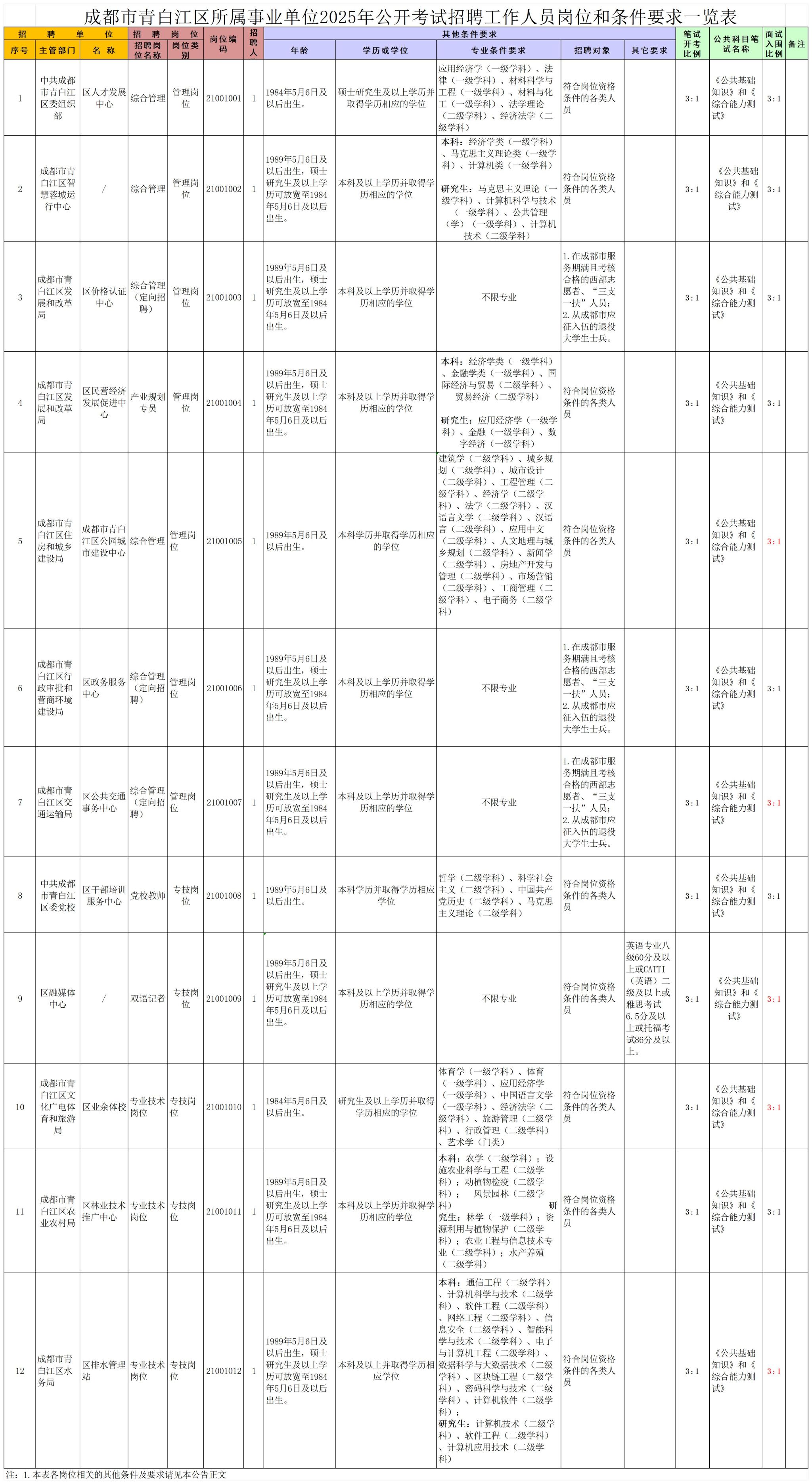 1.成都市青白江区所属事业单位2025年公开考试招聘工作人员岗位和条件要求一览表