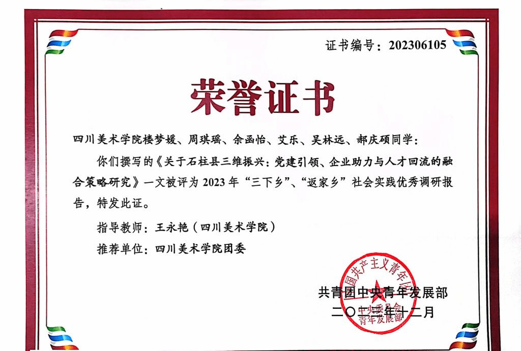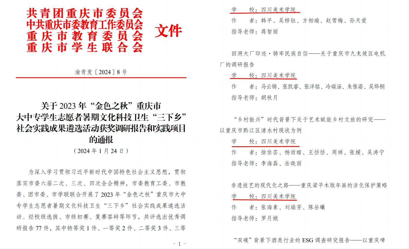 近日,2023年度“三下乡”“返家乡”社会实践优秀调研报告名单及2023年重庆市大中专学生志愿者暑期文化科技卫生“三下乡”获奖情况公布,我校荣获国家级荣誉1项,市级荣誉21项。其中,《关于石柱县三维振兴:党建引领、企业助力与人才回流的融合策略研究》入围120篇全国2023年度“三下乡”“返家乡”社会实践优秀调研报告;我校团委获市级“优秀组织单位”称号;公共艺术学院“金溪清水,公艺创美”艺术赋能乡村振兴服务团等4支团队获“优秀团队”;王永艳等2名教师获“优秀工作者”;徐佳芸等6名同学获“优秀个人”;此外在市级调研报告及实践项目的评选中,荣获实践项目二等奖1项,实践项目优秀奖2项,调研报告优秀奖5项。
