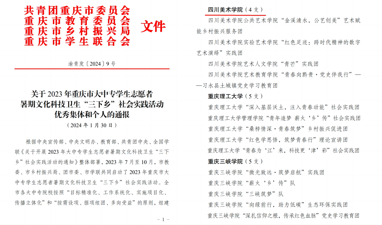 2023年重庆市大中专学生志愿者暑期文化科技卫生“三下乡”社会实践活动优秀团队