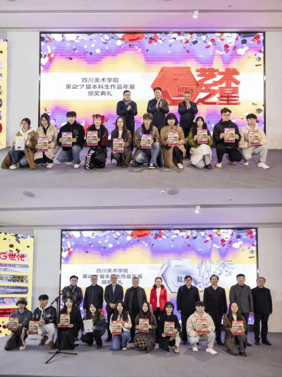 此次年展共计展出作品212件,来自9个学院30多个专业,涵盖绘画、雕塑、设计、工艺等多种表现形式。经校内评审专家及校外特邀评审专家评审,最终评出“优秀作品”59件,“艺术之星”10件。学校党委常委、副院长段胜峰,党委副书记左益分别宣读了四川美术学院第27届本科生作品年展“优秀奖”以及“艺术之星”获奖名单,出席开幕式的领导和特邀嘉宾为获奖学生代表颁奖并合影留念。
