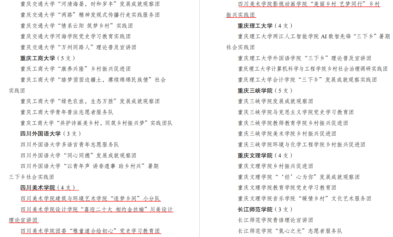 近日,在重庆市2022年大中专学生志愿者暑期文化科技卫生“三下乡”社会实践活动评比中,我校荣获13项表彰。其中,学校团委获得“优秀单位”称号,迄今为止,我校已连续19年获此荣誉;校团委“稚童道合绘初心”党史学习教育团、建筑与环境艺术学院“逐梦乡间”小分队、设计学院“喜迎二十大 相约金丝楠”川美设计理论宣讲团、影视动画学院“美丽乡村 艺梦同行”乡村振兴实践团共计4支团队获得“优秀团队”称号;公共艺术学院团总支书记许冠、艺术教育学院团总支书记邱千千获得“先进工作者”称号;杨洁、高音、杨若澜、陈韵竹、田浩男、盛越6名同学获得“优秀个人”称号。