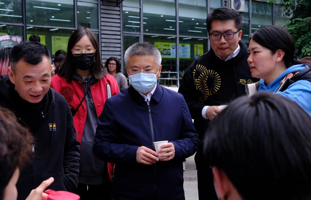 唐青阳、左益在社团招新现场与同学们亲切交流。他们现场了解学生社团的建设情况、发展规模、特色亮点、招新情况等,不时询问社团发展状况,了解社团取得的成绩,为社团发展指点迷津。