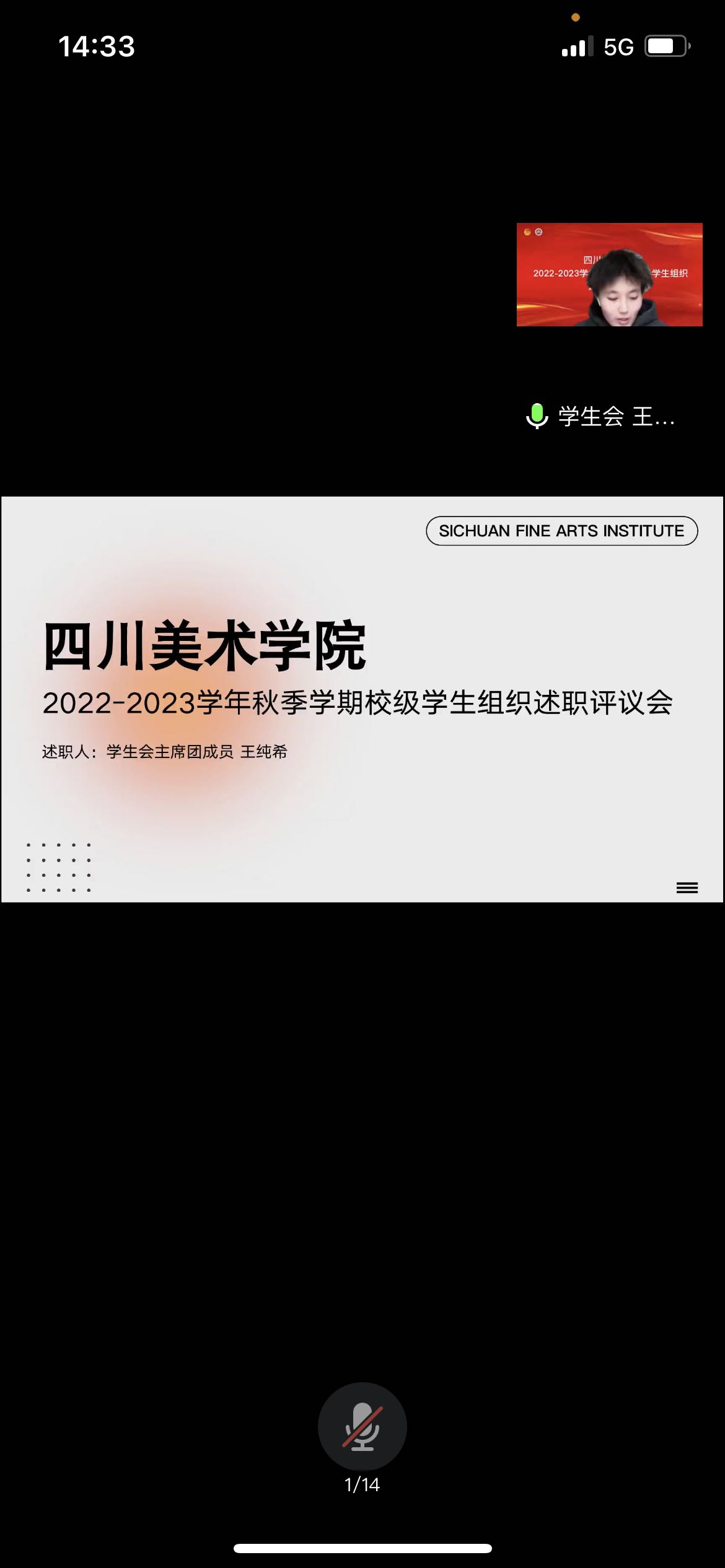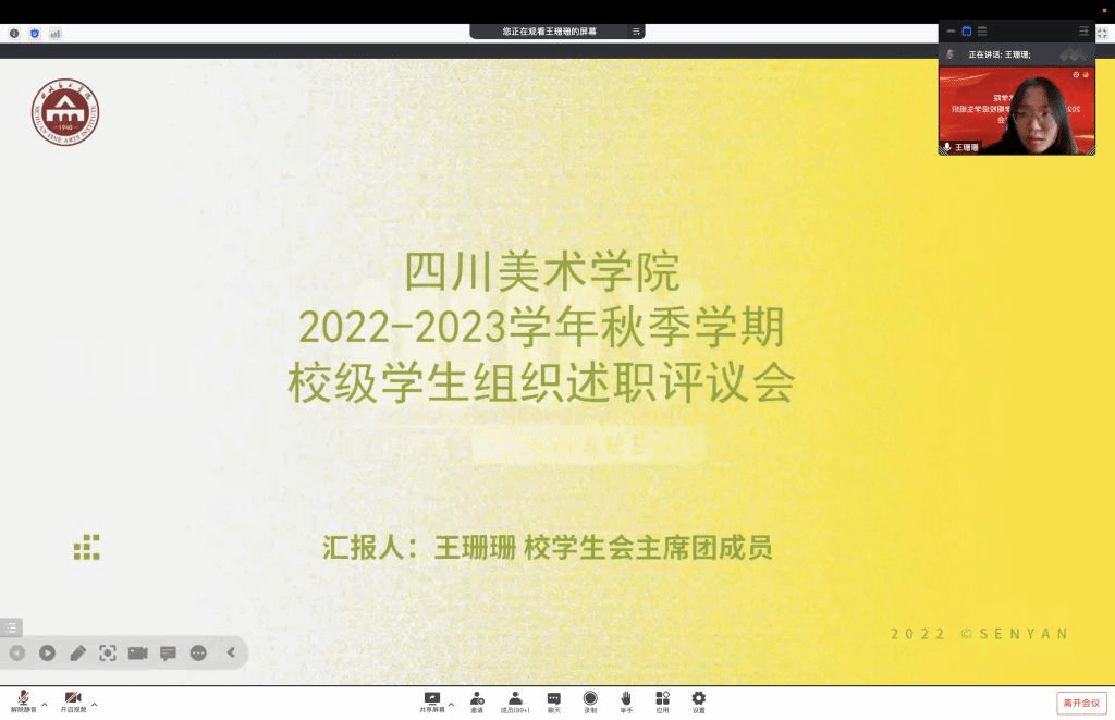 为深学笃用习近平新时代中国特色社会主义思想,深入学习宣传贯彻党的二十大精神,全面贯彻落实习近平总书记关于青年工作的重要思想,进一步规范我校学生组织工作制度化、规范化,按照《关于推动高校学生会(研究生会)深化改革的若干意见》《关于高校学生会(研究生会)述职评议会的工作指引(试行)》等文件要求,12月21日下午2点30分,学校通过腾讯会议召开了四川美术学院2022-2023学年秋季学期校级学生组织述职评议会,学生处处长杜泰山,校团委书记吴倩,研究生处副处长刘珊珊,研究生会秘书长许冰以及团委干事胡秋月等参加会议。会议由校学生会秘书长杨晗主持。