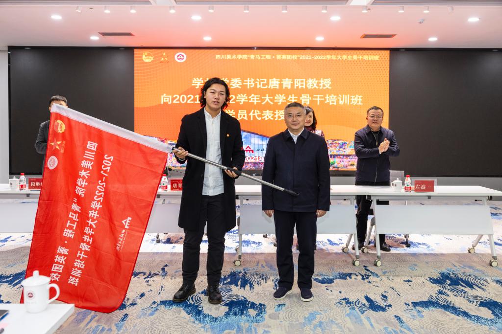 仪式上,唐青阳向2021-2022学年大学生骨干培训班授予旗帜。