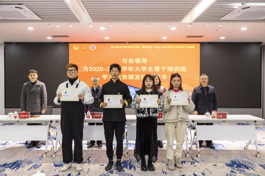 与会领导为2020-2021学年大学生骨干培训班学员代表颁发了结业证书,为2021-2022学年大学生骨干培训班学员代表赠送了学习书籍,公共艺术学院的王潇同学作为学员代表发言。